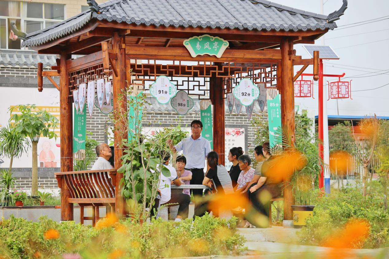 草寺村支部书记在易风亭里给村民们“算账”。刘丽 摄