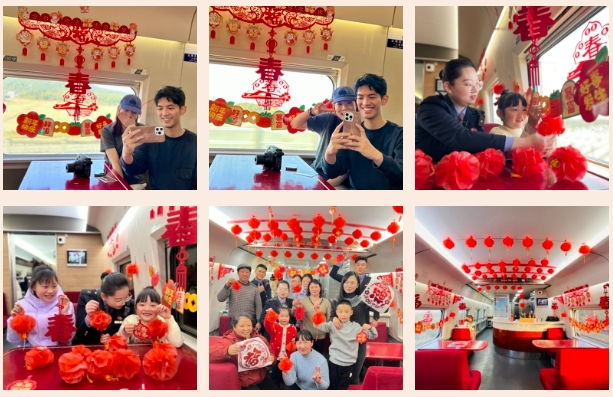 G1391次列车上,红灯笼高高挂起,窗户上贴满了精致的窗花,乘客们带着大包小包的年货归心似箭,每个人的脸上都洋溢着回家过年的喜悦。