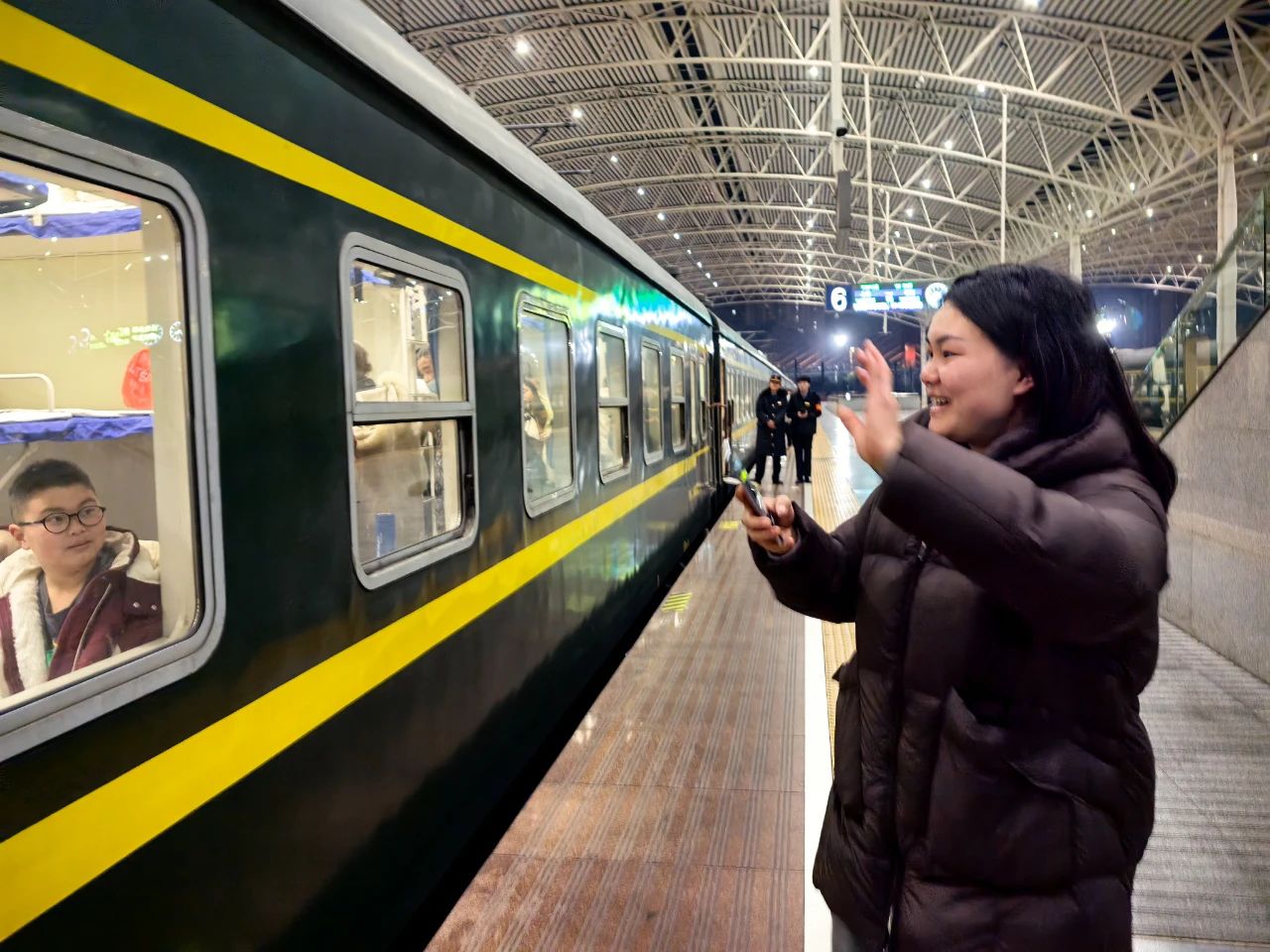 站台上,一位母亲轻轻地朝孩子挥了挥手,目送心中的牵挂踏上归途的列车。