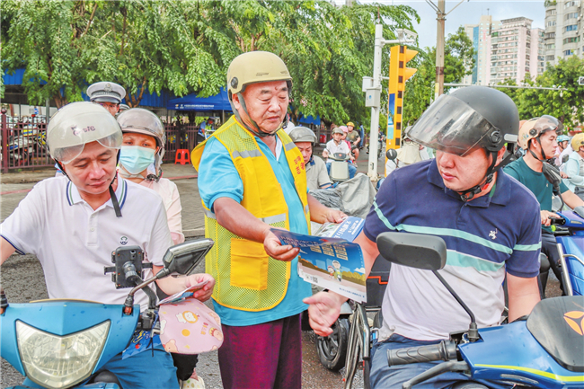 9月16日,在金龙路与玉沙路交叉口,电动自行车驾驶员正在体验辅助执法,向市民群众发放交通安全知识宣传单。孙士杰 摄