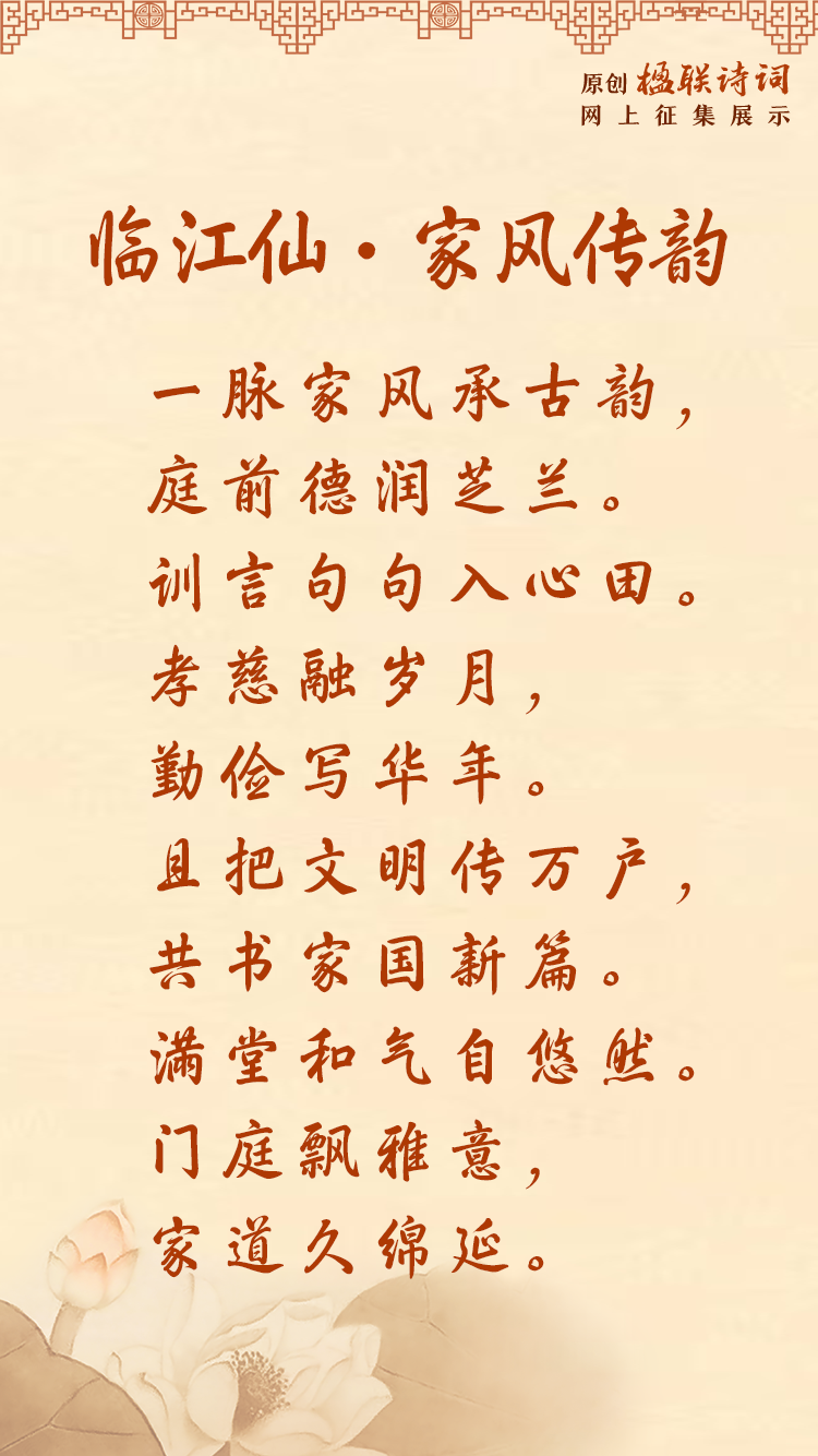 这首词围绕家风展开,以细腻且富有诗意的笔触,描绘了良好家风的内涵、传承意义及其对社会和国家的积极影响,整体风格典雅、意境悠远。