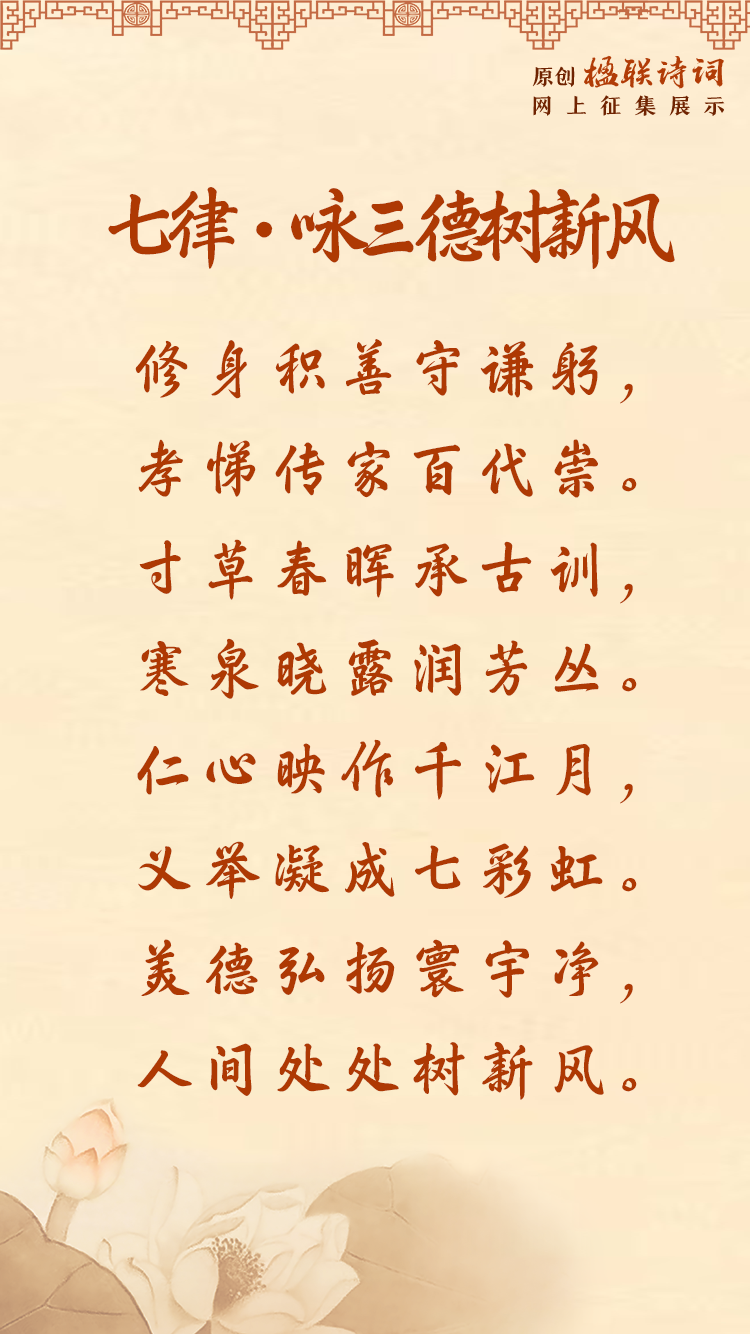 这首诗既饱含对中华传统美德的深情赞颂,以修身积善、孝悌传家、仁心义举为核心的中华传统美德,是滋养人心的精神养分;通过代代传承与全民践行,既能净化社会风气,更能推动新时代文明新风的树立,让美德成为人间普遍遵循的价值追求。